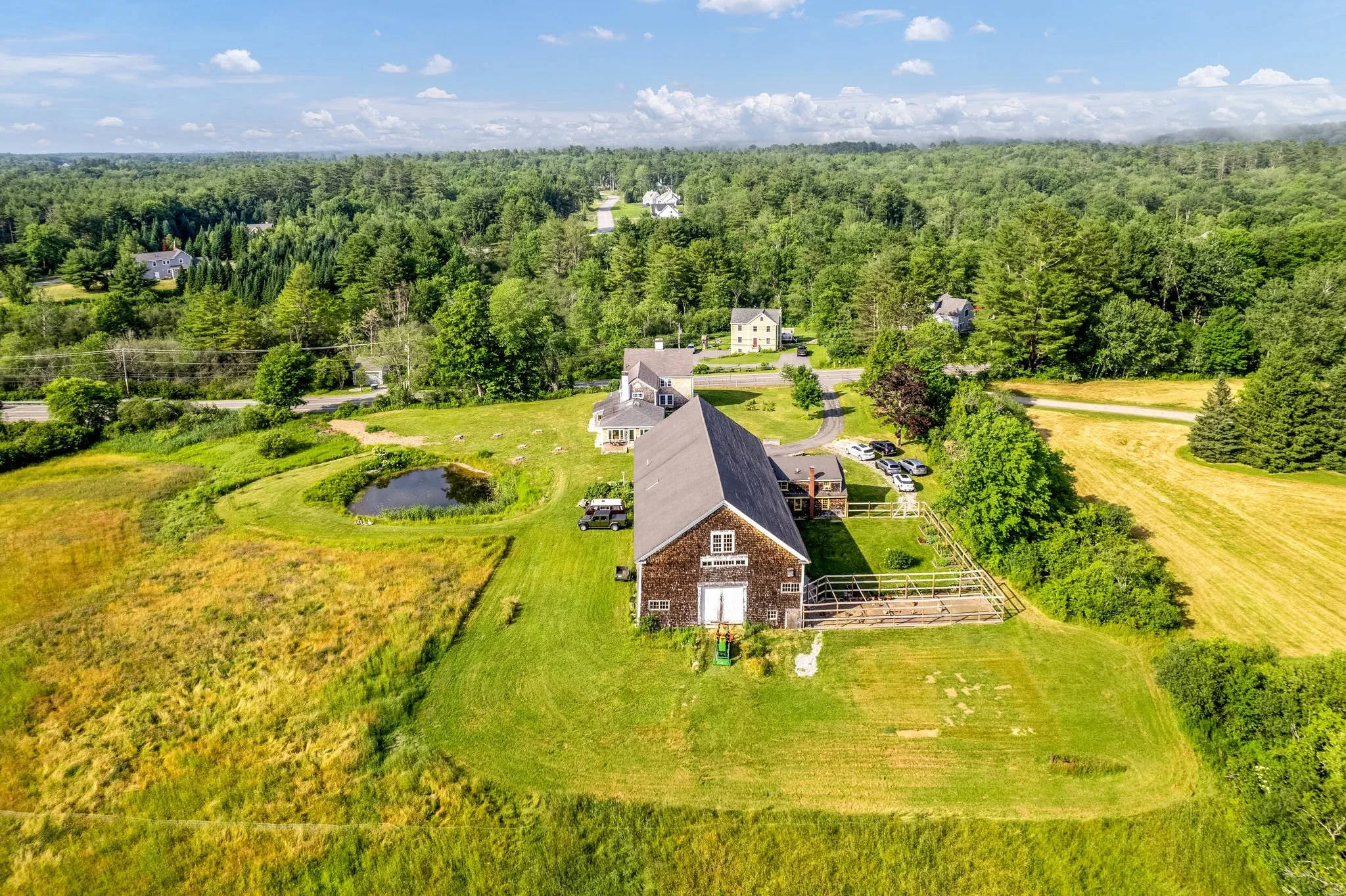 The vaulted ceiling, open concept kitchen, and great room are a modern masterpiece and look onto the fields and pond. The main level offers a spare bedroom, full bath, reading room, formal dining, library, and sitting room along with a modern farmhouse kitchen. The second floor offers two bedrooms with a full bath and an expansive primary suite with a dedicated bath. Outside, we head to the barn and attached cottage. Open the door and you are transported to the English Countryside. You can't help but be charmed at every corner and in every room. This area was completely reimagined by the owners and offers living, dining, galley kitchen, living room with direct garden access, laundry, and a generous bedroom. Talk about the perfect place for guests, multi-generation living, or an ideal ADU. The cottage is attached to one of the most memorable and remarkable barns in Maine. This breathtaking 100' structure has been and is home to livestock and now offers a terrific 400sq/ft art, pottery, writing, working.. studio.